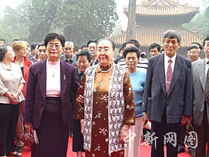 孔廟大成殿前懸掛著的“紀念孔子兩千五百五十四年誕辰”橫幅和“先師功德垂青史,儒學精華照五洲”的對聯(lián),表達出海峽兩岸孔子后裔及海內(nèi)外儒學信仰者的共同心愿。孔子第七十七代嫡孫孔德懋受在海峽彼岸臺灣的孔德成先生的委托,與家人一起來到大成殿前,祭拜祖先。眾多海內(nèi)外孔子后裔與來自印尼、韓國、馬來西亞、美國、香港、臺灣、澳門等十多個國家和地區(qū)的祭孔參禮團的數(shù)百名來賓祭拜了“至圣先師”——孔子。
