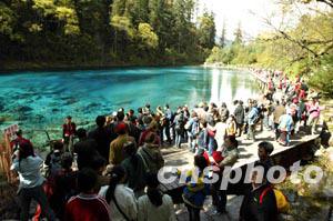 中國內(nèi)地“十一”黃金周開始,世界自然遺產(chǎn)、著名風(fēng)景區(qū)九寨溝迎來大批觀光客,風(fēng)景秀美的五彩池被游客團團包圍。中新社記者:毛建軍