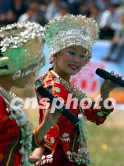貴州省黔東南自治州苗族姑娘在國慶黃金周里以優(yōu)美的傳統(tǒng)山歌迎接游客。這個民族的青年男女有以歌傳情、以舞達意的風(fēng)俗。中新社記者:宋吉河