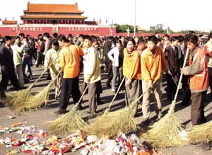 “我們前面掃過去,發(fā)小廣告的在后面發(fā),掃的還沒有發(fā)的快!弊蛱,東城區(qū)環(huán)衛(wèi)局專業(yè)管理科張德良這樣抱怨道,“我們東城、西城等四個(gè)區(qū)的環(huán)衛(wèi)工人在天安門廣場從早上5點(diǎn)到晚上9點(diǎn)連續(xù)作業(yè),也掃不凈!