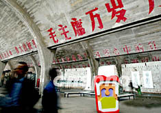 照片和裝置藝術,配上陳舊的機床與剝落的標語,由五十年代舊廠房改建的“798藝術新區(qū)”成為北京黃金周的新旅游熱點。中新社記者:鄭萍萍