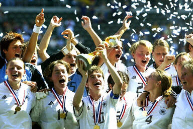 加時賽開始后,德國隊發(fā)起了一浪浪的攻勢,加時賽上半段第7分鐘,德國隊獲得禁區(qū)外間接任意球的機會,6號隊員將球傳給尼婭·金策爾,這名替補隊員在兩名瑞典后衛(wèi)的夾防下躍起頭球攻門,為德國隊打入一粒金球。憑借著這個入球,德國女足2比1擊敗瑞典隊,第一次捧起了世界杯的冠軍獎杯。