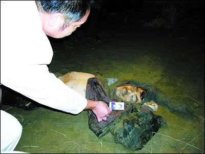 警方隨即加派警力,調(diào)派民兵在天門、潛江兩岸沿漢江進行搜索。23時01分,天門市同興村碼頭漁民用滾鉤撈起一具白襯衣、黑褲子、光著腳板的男尸。男尸眼睛微睜,胡子很深,額頭上有一個拳頭大的洞,與警方所公布的通緝令相似。
