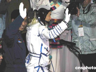 楊利偉隨后激動地和翟志剛、聶海勝相互握手擁抱,并頻頻向歡送的人群揮手致意。