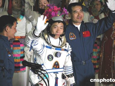 五時(shí)二十八分,循著這有些激動的聲音,只見身著乳白色航天服的首飛航天員楊利偉邁著從容而穩(wěn)健的步伐,從問天閣航天員的專用通道,微笑著向大家走來。緊隨他身后的是身著天藍(lán)色訓(xùn)練服的航天員翟志剛和聶海勝。隨著歡快的《迎賓曲》奏起,航天員們被掌聲和鮮花包圍著。