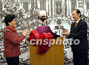 這,就是何鴻燊博士捐款六百多萬元人民幣,自海外搶救的圓明園豬首銅像。國務(wù)委員陳至立與何鴻燊共同為這件回歸的國寶揭幕。