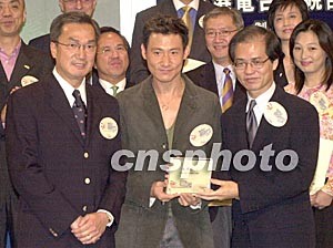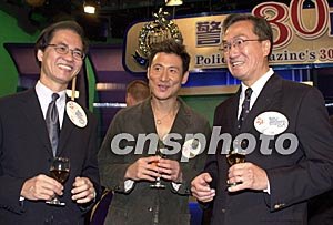 10月16日,香港電臺與警務處聯(lián)合制作的電視節(jié)目《警訊》舉行三十周年紀念典禮,警務處處長曾蔭培及廣播處長朱培慶與歌星張學友于活動上言談甚歡。作者:鄧慶樂