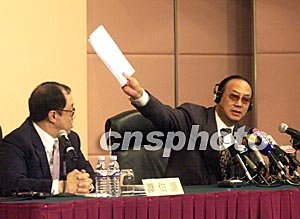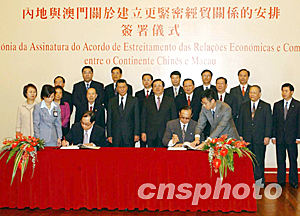 “內(nèi)地與澳門關(guān)于建立更緊密經(jīng)貿(mào)關(guān)系的安排”十七日下午在澳門特區(qū)政府總部舉行簽署儀式,國家商務(wù)部副部長安民和澳門經(jīng)濟(jì)財政司司長譚伯源,分別代表中央政府和澳門特區(qū)政府在協(xié)議上簽字,國家副主席曾慶紅專程來澳出席了簽署儀式。