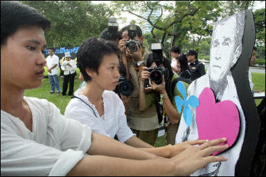 中新網(wǎng)10月19日電 據(jù)法新社報(bào)道,為了反對美國與泰國達(dá)成自由貿(mào)易政策,泰國農(nóng)民近日舉行示威游行,并用傳統(tǒng)的詛咒方式給布什總統(tǒng)“下降頭”,以“抓住”布什的靈魂,并將其沉入河底,希望藉此能永遠(yuǎn)免受其害。