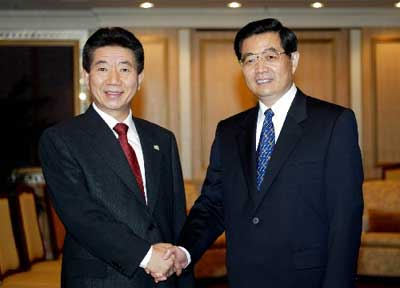 胡錦濤對(duì)盧武鉉說:今年7月你訪問中國時(shí),我們雙方?jīng)Q定建立中韓全面合作伙伴關(guān)系,并確定了雙邊合作的重點(diǎn)領(lǐng)域。在這一精神的推動(dòng)下,兩國在各方面的合作都取得了新的進(jìn)展。兩國領(lǐng)導(dǎo)人經(jīng)常見面體現(xiàn)了我們之間的良好關(guān)系。目前,兩國經(jīng)貿(mào)合作發(fā)展迅速,今年1月至9月,雙邊貿(mào)易額已達(dá)440億美元。我們認(rèn)為,中韓關(guān)系的順利發(fā)展,友好合作的不斷擴(kuò)大,為中韓兩國人民帶來了實(shí)實(shí)在在的利益。希望雙方進(jìn)一步共同努力,積極開拓,將中韓全面合作伙伴關(guān)系落到實(shí)處。