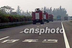 記者今天與海南省公安消防總隊(duì)進(jìn)口的多功能消防車隊(duì)四度“遭遇”:一清早這個(gè)靜候在?谑旋埨ツ下放缘幕鸺t車隊(duì)吸引了路人的視線;大約九點(diǎn)半,在高速公路上,它們從記者車旁呼嘯而過(guò);當(dāng)記者抵達(dá)博鰲亞洲論壇國(guó)際會(huì)議中心時(shí),只見這個(gè)消防隊(duì)伍已演練完畢撤離現(xiàn)場(chǎng);而下午四時(shí),在海口市的街頭,記者又一次與它們相遇。