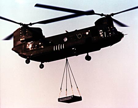 在越南戰(zhàn)爭中,CH-47A主要用于為陸軍部隊(duì)運(yùn)送兵員物資,特別是在為炮兵吊送火炮到不便進(jìn)入的復(fù)雜地帶,為前線輸送油料(一次外吊2個各500加化容量的軟油箱)和回收近降或受傷在外的直升機(jī)(一次可吊一加UH-1)方面獲得好評。在越南南方,當(dāng)以200千米/小時的速度全速低空飛行時,基本不需要別的飛機(jī)的護(hù)航。但渦輪式發(fā)動機(jī)在高山、高溫季節(jié)中出力不足,影響了性能的正常發(fā)揮。曾有3架CH-47A被改為重火力空中護(hù)航機(jī),共裝備7.7毫米機(jī)槍7挺、20毫米機(jī)炮3門、40毫米擲彈筒一具和火箭發(fā)射巢1具,型號為ACH-47A。