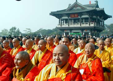 昨天在大明寺棲靈塔下舉行了盛大的紀念大會。來自國家、江蘇省有關方面的官員,鑒真東渡經(jīng)過及學習過的寺廟之諸山長老法師及港澳臺和日本的客人數(shù)千人參加了大會。紀念大會由揚州市委副書記、常務副市長洪錦華主持,中央統(tǒng)戰(zhàn)部副部長朱維群、國家宗教事務局局長葉小文、中日友好協(xié)會副會長文遲、中國佛教協(xié)會副會長學誠法師、江蘇省副省長何權、省委統(tǒng)戰(zhàn)部副部長、省宗教事務局局長翁振進、省臺辦副主任潘朗哉、省對外友協(xié)副會長、省佛教協(xié)會會長明學法師、日本駐滬總領事杉本信行、日本奈良唐招提寺益田快范長老、臺灣佛光山開山宗長星云、香港大學副校長、中國工程院院士李焯芬,揚州市府官員孫志軍、季建業(yè)、徐益民等參加了大會。