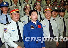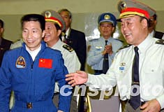 楊利偉與中國首次載人航天飛行代表團受到駐港部隊司令員王繼堂、政委王玉發(fā)和官兵們的熱烈歡迎。