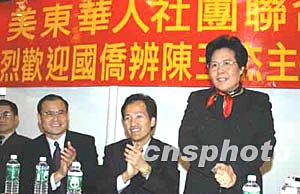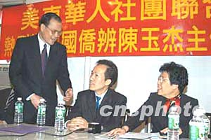 今天早晨,陳玉杰一行七人首先到紐約華埠拜訪美東華人社團(tuán)聯(lián)合總會(huì),雖然只是臨時(shí)會(huì)所,但陳玉杰為能親臨僑團(tuán)感到高興。由于“非典”原因,今年一月出任國(guó)僑辦主任的陳玉杰上任十一個(gè)月來一直未能到海外與僑胞見面,昨天下午抵達(dá)紐約的陳玉杰每次見到僑胞都為此致歉。如今在海外僑團(tuán)的會(huì)所里,面對(duì)親切的僑胞,陳玉杰說自己表個(gè)態(tài):將竭盡全力為僑服務(wù)。