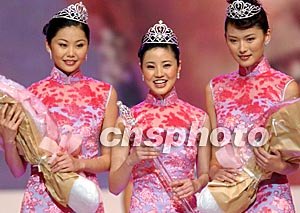 “2003中華小姐環(huán)球大賽”總決賽11月8日晚在香港會(huì)展中心舉行,圖為來自上海的佳麗江欣榮獲大賽冠軍、吉林佳麗胡古玥(左)獲亞軍、黑龍江佳麗谷雨(右)獲季軍。中新社記者:錢興強(qiáng)