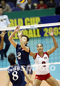 2003年11月9日,第九屆女排世界杯賽在日本舉行。多米尼加隊9號隊員阿里亞斯被查出服用興奮劑。圖為11月3日阿里亞斯(右)在同中國隊的比賽時準備攔網(wǎng)。中體在線/供圖