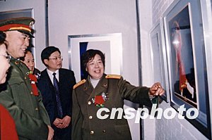 一百一十周年邵華舞臺藝術(shù)攝影作品展,十一日在山東省城濟(jì)南東方藝術(shù)館舉行,毛澤東的兒媳婦邵華(右一)少將向來賓介紹作品。作者:郝帆