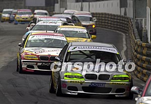 澳門第五十屆格蘭披治大賽車十六日進行澳門博彩股份公司東望洋大賽,圖為比賽正在激烈進行中。中新社記者:李剛