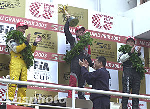 澳門第五十屆格蘭披治大賽車十六日舉行最精彩的三級方程式大賽,澳門特區(qū)行政長官何厚鏵賽后親自為獲得前三名的車手頒獎。中新社記者:李剛