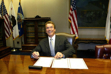 阿諾·施瓦辛格于美國當(dāng)?shù)貢r間11月17日宣誓就任加利福尼亞州第38任州長。施瓦辛格宣誓就職儀式吸引了大約740名記者參加,規(guī)?氨让绹偨y(tǒng)就職儀式,世界各地數(shù)百萬觀眾觀看了儀式的現(xiàn)場直播。圖為施瓦辛格新官上任首日喜簽首個州長令。