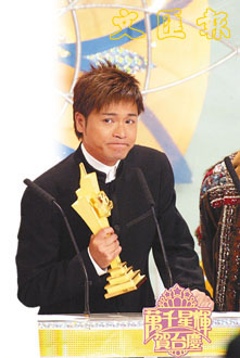 而“我最喜愛的男主角”一獎(jiǎng)中,賽前穩(wěn)操勝券的郭晉安眾望所歸,憑借對(duì)《憨夫成龍》里“阿旺”一角的出色表演奪獎(jiǎng)。領(lǐng)獎(jiǎng)時(shí)刻他激動(dòng)地感謝17年來支持他的人。郭晉安特別表示﹕“當(dāng)任何人都不相信我有機(jī)會(huì)站在頒獎(jiǎng)臺(tái)做男主角時(shí),很感謝梁家樹(無線戲劇組高層)給予我信心!