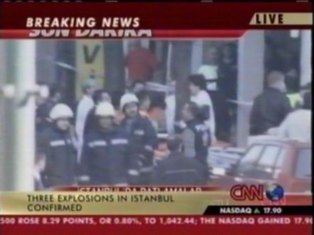 北京時(shí)間11月20日下午,位于土耳其伊斯坦布爾北部的土耳其匯豐銀行總部附近發(fā)生兩次爆炸,部分銀行建筑被摧毀。此后英國駐伊斯坦布爾領(lǐng)事館以及一個(gè)居民區(qū)和一座清真寺也遭到襲擊。圖為土耳其警察趕到爆炸現(xiàn)場。(春風(fēng))
