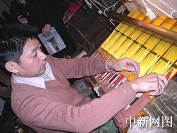 織造南京云錦的老式提花木機,每臺織機須有提花工和織造工兩人配合,前者在上,后者在下,上下協(xié)同生產(chǎn)。兩人勞作一天,僅能織造云錦五厘米長。