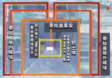 物探發(fā)現(xiàn)地宮中的墓室和宮墻均為石質結構,地宮在封土堆以下30米左右,地宮中的墓室邊界東西長約170米,南北寬約145米。這是一種迄今為止首次發(fā)現(xiàn)的墓葬形式,在物探考古過程中,專家還發(fā)現(xiàn)大范圍、強異常的汞含量,初步證實了《史記》中記載的“以水銀為百川、江河、大!钡恼鎸嵭。