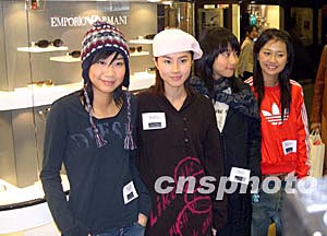 香港流行音樂組合Cookies為品牌眼鏡宣傳。一個(gè)品牌眼鏡5日展示2004年春夏眼鏡系列,香港流行音樂組合Cookies 出席記者會(huì)為其宣傳。中新社記者:譚達(dá)明  香港藝人楊婉儀5日在一品牌眼鏡記者會(huì)時(shí),戴上新款眼鏡。中新社記者:譚達(dá)明