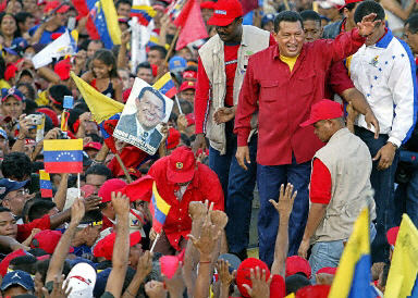 委內(nèi)瑞拉數(shù)十萬擁護(hù)查韋斯的民眾6日在首都加拉加斯舉行大規(guī)模游行,慶祝查韋斯選舉獲勝5周年。