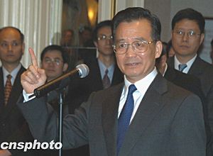 傍晚,與五百多名華僑華人見(jiàn)面時(shí),溫家寶說(shuō)了四句話:祖國(guó)想念你們,祖國(guó)要強(qiáng)大,祖國(guó)要和平,祖國(guó)要統(tǒng)一。