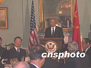 會(huì)見后,溫家寶出席了鮑威爾舉行的歡迎宴會(huì)。李肇星等中方陪同人員和美國(guó)財(cái)政部長(zhǎng)斯諾、總統(tǒng)國(guó)家安全事務(wù)助理賴斯等出席。完