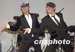 歌星譚詠麟、李克勤12月10日在香港出席《左麟右李04開心演唱會》記者會,擅長搞氣氛的譚詠麟及李克勤會上模仿米高積遜臺風,增添笑料。作者:鄧慶樂