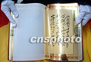 為紀(jì)念毛澤東誕辰110周年,由中央文獻(xiàn)出版社出版的純金版《毛澤東詩(shī)詞手跡》十六日在蘇州限量發(fā)行。金書(shū)以純度達(dá)99.9%的黃金紙為材質(zhì),詩(shī)詞集為古籍16開(kāi)本,封面上鑲嵌著純金的毛澤東頭像紀(jì)念章,36頁(yè)金紙收錄了《沁園春·雪》等17幅毛澤東詩(shī)詞手跡。這部金書(shū)海內(nèi)外限量發(fā)行5000套,每套定價(jià)18600元人民幣。作者:蔣振江