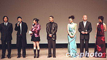 中國大陸著名“票房冠軍導(dǎo)演”馮小剛2003年初退出賀歲片大戰(zhàn)后,今年卷土重來,傾心拍攝了2004年賀歲大片《手機(jī)》,首映禮12月16日晚在北京海淀影劇院舉行。該片攝制組全體亮相慶賀《手機(jī)》將于12月18日在全國上映。圖為影片《手機(jī)》(從左到右)編劇劉震云、導(dǎo)演馮小剛、主持人李霞、主演張國立、范冰冰、葛優(yōu)和徐帆出席該儀式。作者:高遠(yuǎn)