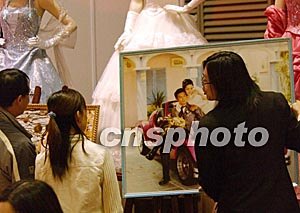 香港圣誕婚紗及結(jié)婚用品展十二月十九日在香港會展中心開幕,是次展會是2003年底香港舉辦的最大型的婚紗展,又正值歡度圣誕節(jié)之際,展會上結(jié)婚用品款式繁多,圖為婚慶公司向參觀者介紹婚紗攝影。中新社記者:錢興強
