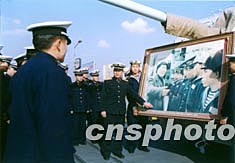 毛澤東于1953年2月19日首次視察解放軍海軍部隊(duì),在武漢登上“洛陽”艦和該艦官兵一起航行,并揮毫題詞:“為了反對帝國主義的侵略,我們一定要建立強(qiáng)大的海軍”!奥尻枴迸灩俦12月20日在毛主席與“洛陽”艦官兵交談的巨幅照片前重溫領(lǐng)袖題詞,紀(jì)念毛澤東誕辰110周年。作者:毛昭勝