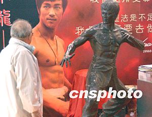 連日來在香港會展中心舉行的“亞洲游戲展2003”每天吸引眾多參觀者,圖為展會上李小龍的雕像引人注目。作者:錢興強(qiáng)