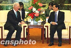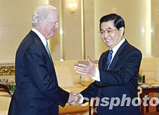 中新網(wǎng)12月29日電 據(jù)中國外交部消息,2003年12月29日下午,中國國家主席胡錦濤在人民大會(huì)堂會(huì)見了美國總統(tǒng)特使、前國務(wù)卿貝克。賓主進(jìn)行了友好的談話。