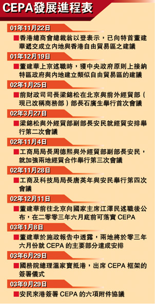 在二零零三年六月簽署的CEPA包括貨物貿(mào)易、服務(wù)貿(mào)易和貿(mào)易投資便利化三部分。其中,貨物貿(mào)易部分規(guī)定,自二零零四年一月一日起,對輸往內(nèi)地的二百七十三種原產(chǎn)于香港的貨物實行零關(guān)稅。(戴慶成)