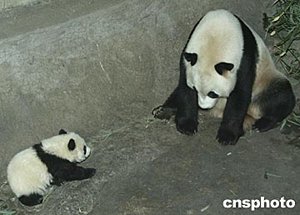 2004年新年鐘聲敲響前的2003年12月31日晚,出生整整一百三十天的北京動(dòng)物園大熊貓“甜甜”在媽媽“妞妞”期待的目光和輕聲的召喚聲中,搖搖晃晃一步一步向前走。“甜甜”2003年8月24日在北京動(dòng)物園出生,目前的體重已經(jīng)從出生時(shí)的150克增長(zhǎng)到8,060克,預(yù)計(jì)在半周歲后斷奶離開(kāi)媽媽獨(dú)立生活。中新社記者:任晨鳴