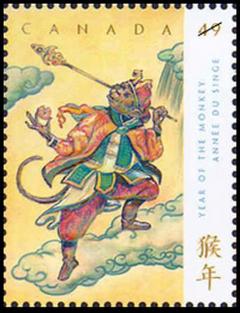 中新網(wǎng)1月4日電 加拿大郵政局按中國(guó)人傳統(tǒng),在生肖屬猴的農(nóng)歷新年到來(lái)之前將從元月8日起發(fā)行猴年郵票一套共兩枚,面值分別為4角9分(加元,下同)和1元4角。
