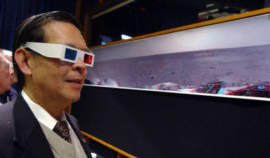 1月5日,在美國加利福尼亞州帕薩迪納的宇航局噴氣推進(jìn)實驗室,彼特博士配戴著立體眼鏡觀看“勇氣”號火星探測器搭載的照相機拍攝的三維圖像。