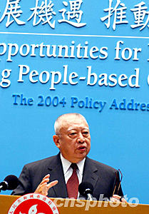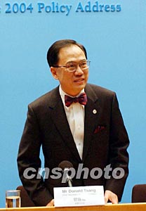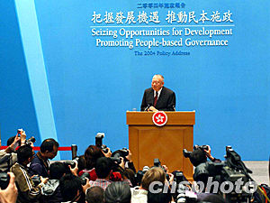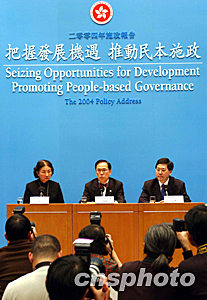 香港行政長官董建華一月七日在此間發(fā)表施政報(bào)告后舉行記者會(huì)。他表示,現(xiàn)時(shí)經(jīng)濟(jì)環(huán)境已好轉(zhuǎn),今年的施政報(bào)告要扎扎實(shí)實(shí)繼續(xù)去落實(shí)已經(jīng)獲得的成果。作者:潘索菲