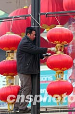 中國(guó)農(nóng)歷新年即將來(lái)臨,一名工人正在北京街頭安裝大紅燈籠。新春佳節(jié)臨近,北京的新年氣氛越來(lái)越濃。中新社記者:張煒