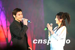 中國600多名藝術家十一日歡聚北京,在中國文聯(lián)舉辦的《百花迎春--中國文學藝術界2004春節(jié)大聯(lián)歡》上慶祝即將來臨的新春佳節(jié),演員趙薇、陸毅同臺演唱《好人好夢》。中新社記者:王瑤