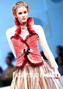 香港1月15日舉辦“香港國際時裝設(shè)計師表演”專場,圖為模特展示來自加拿大時裝設(shè)計師陳慧南的作品。中新社記者:洪少葵