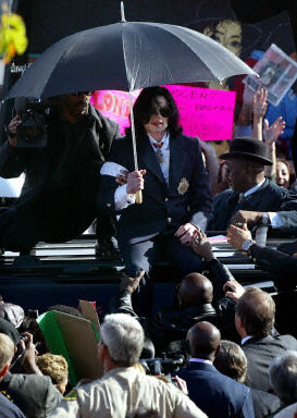 杰克遜在抵達(dá)加州圣瑪麗亞法庭時(shí)受到一群手持歡迎標(biāo)語(yǔ)牌和支持條幅的歌迷的歡迎。當(dāng)杰克遜從汽車(chē)?yán)镒叱鰜?lái)時(shí),等候在那里的他的一些歌迷哭了起來(lái),并唱起了歌,一些人揮動(dòng)手中的聲稱“杰克遜是無(wú)辜的”支持標(biāo)語(yǔ)。