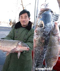 中國(guó)農(nóng)歷春節(jié)即將來(lái)臨,一名商販在北京懷柔區(qū)的春節(jié)市場(chǎng)向顧客介紹懷柔水庫(kù)的巨型魚。此種魚小則五、六斤,大到二、三十斤,且大多鮮活。中新社記者:任海霞